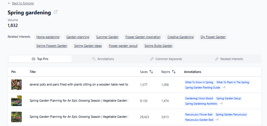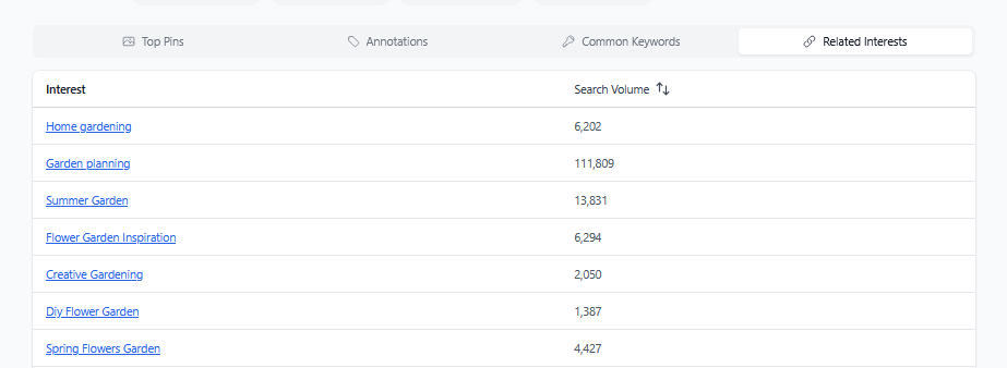 See the interests Pinterest connects to your topic — so you can expand content angles that get served in search + the feed.